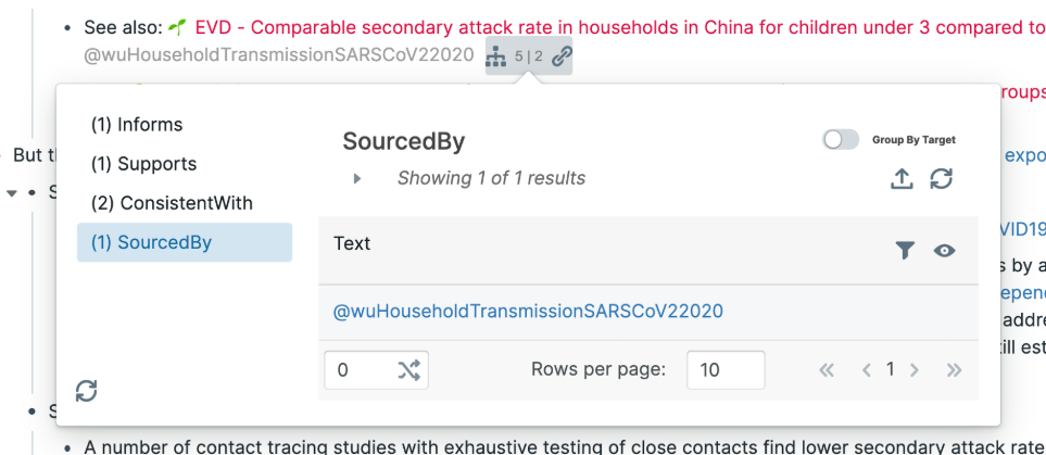 For example, the following score display denotes that the node participates in 5 discourse relations with other nodes, which can be seen in detail in the discourse context popover (1 informs, 1 supports, 2 consistent with, and 1 sourced by; note that 2 of these relations are custom relations).